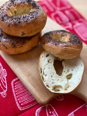 卵と麦芽を使用し、塩を入れないで作った生地を、蜂蜜入りのお湯で茹でてから石窯で焼き上げます。リングがはっきりした形、外側はサックリ、中身もっちり!ほんのり甘みがあり風味豊かです。