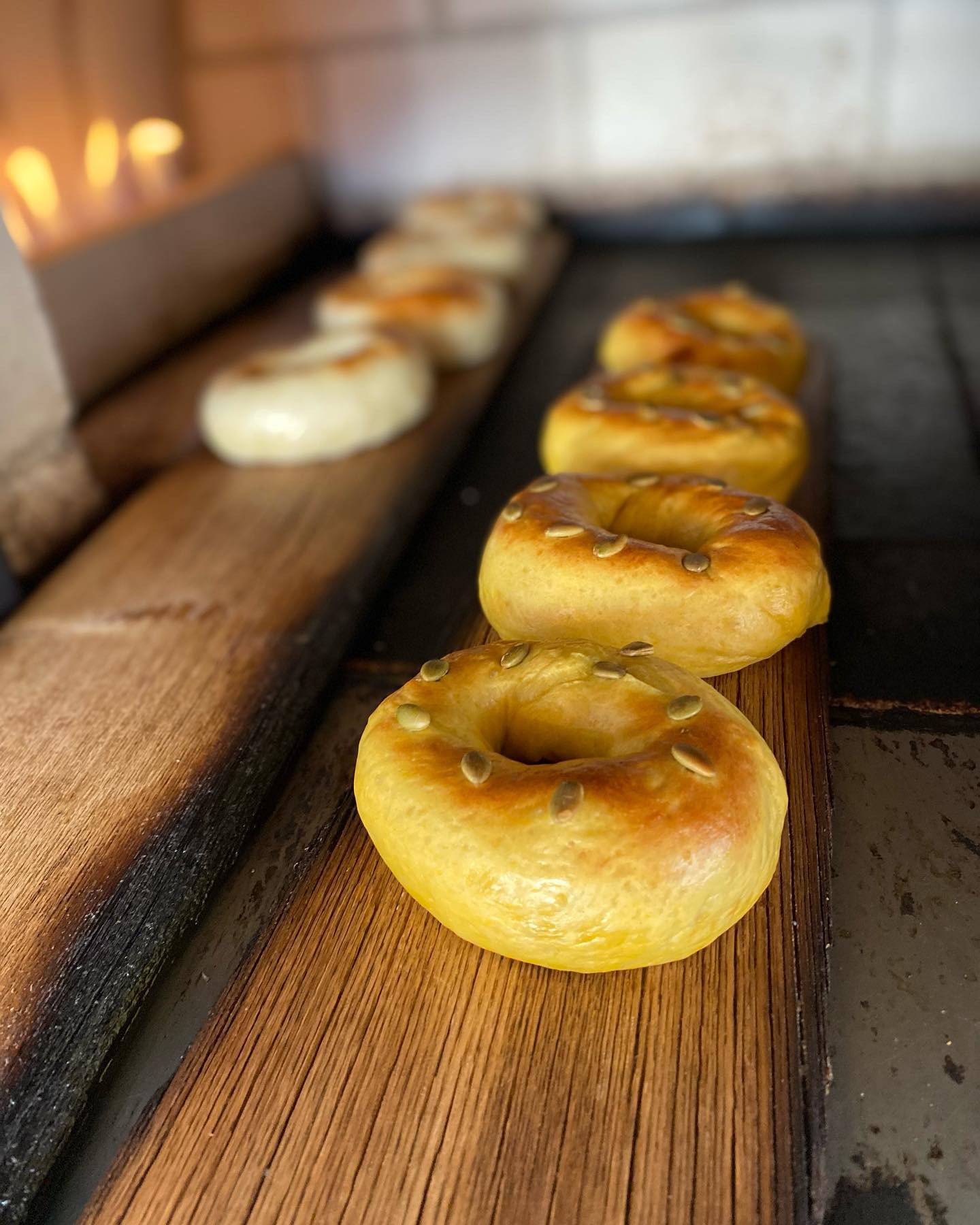 卵と麦芽を使用し、塩を入れないで作った生地を、蜂蜜入りのお湯で茹でてから石窯で焼き上げます。リングがはっきりした形、外側はサックリ、中身もっちりら!ほんのり甘みがあり風味豊かです。