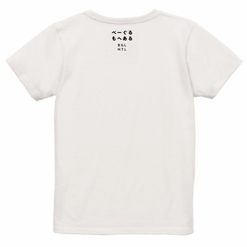 べーぐるもへあるのロゴを胸元にあしらったレディースTシャツです。バックにも店名を小さくプリントしてあります。