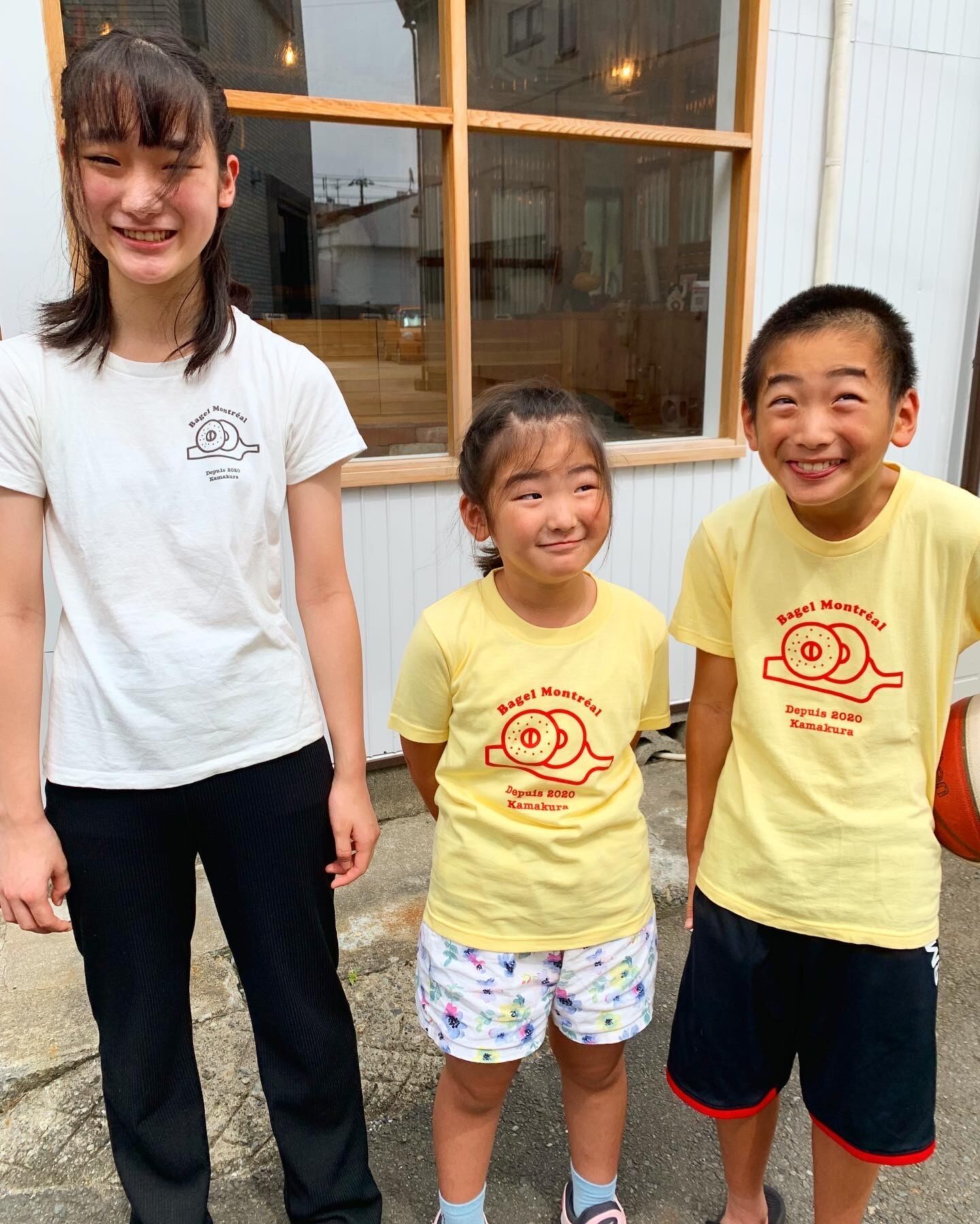 べーぐるもへあるのロゴを中央に大きくプリントしたキッズタイプのTシャツです。バックの襟下にも小さく店名と窯出しベーグルのデザインが施されています。
